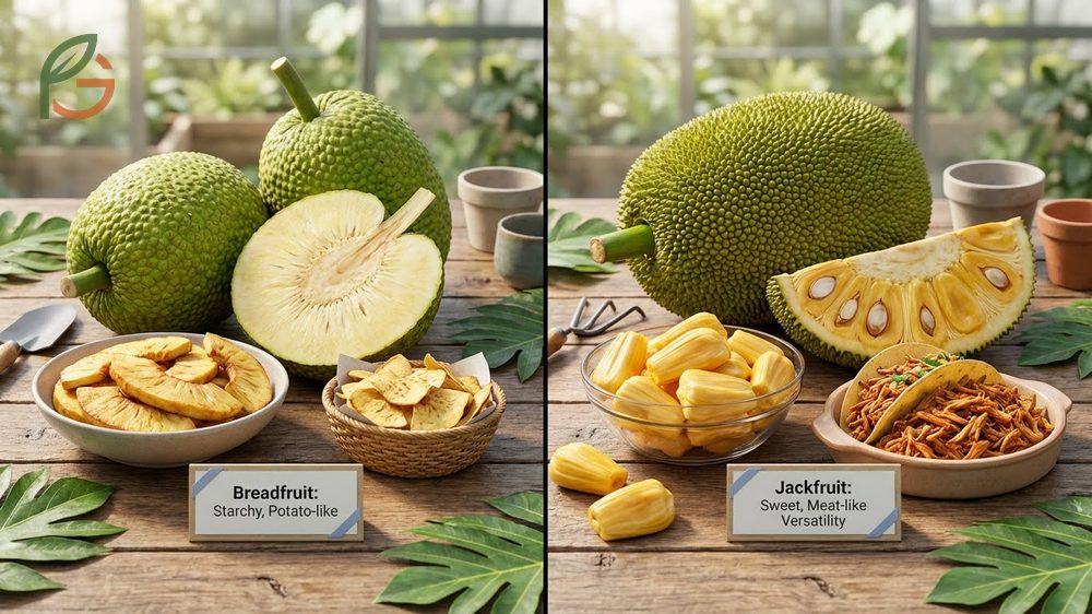 Breadfruit vs Jackfruit differences are significant despite their family ties—breadfruit delivers starchy, potato-like texture with higher fiber, while jackfruit offers sweet, aromatic flavor and meat-like versatility when unripe.[1] Both belong to the mulberry family but serve distinct culinary roles for U.S. gardeners and tropical fruit enthusiasts. FruitGarden synthesizes current agricultural research to help you understand which fruit fits your growing conditions and cooking needs.