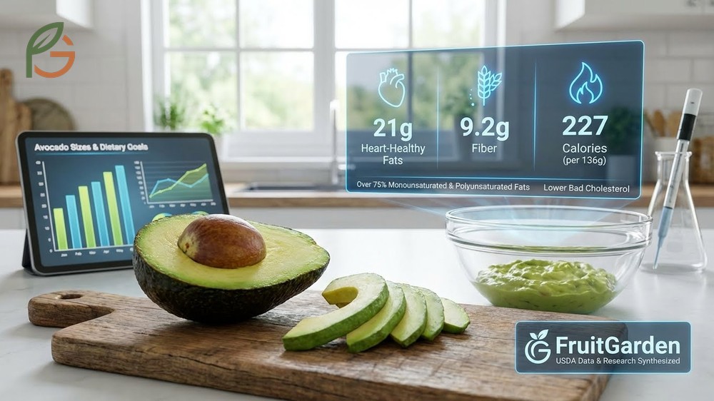 Hass avocado nutrition facts show that one medium fruit (136g) delivers 227 calories, 21g of heart-healthy fats, and 9.2g of fiber[1]. Research from the USDA demonstrates that over 75% of avocado fats are monounsaturated and polyunsaturated, which help lower bad cholesterol levels. FruitGarden synthesizes current USDA data and peer-reviewed nutritional research to help you understand how different avocado sizes fit your dietary goals.