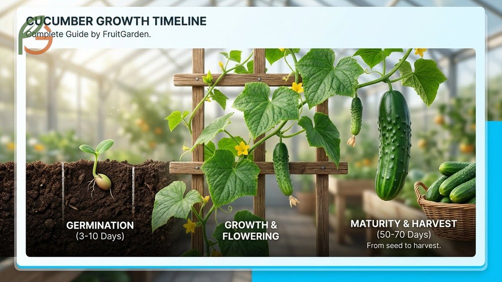 How long do cucumbers take to grow? Most varieties mature in 50-70 days from seed to harvest, with germination starting in just 3-10 days.[1] Research shows that specific growing conditions—temperature, soil quality, and variety selection—directly impact your timeline.[2] FruitGarden synthesizes current agricultural research to help you understand exactly when to expect your first cucumbers and what happens at each growth stage.