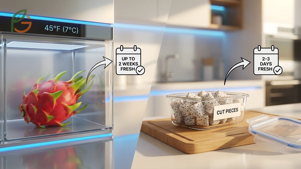 How to store dragon fruit depends on whether it’s whole or cut. Whole dragon fruit lasts up to 2 weeks when refrigerated at 45-50°F (7-10°C)[1], while cut pieces stay fresh only 2-3 days in sealed containers[2]. Research shows proper storage temperature and moisture control extend freshness by 300% compared to counter storage. FruitGarden synthesizes current agricultural research to help you maximize your tropical fruit’s shelf life and nutritional value.